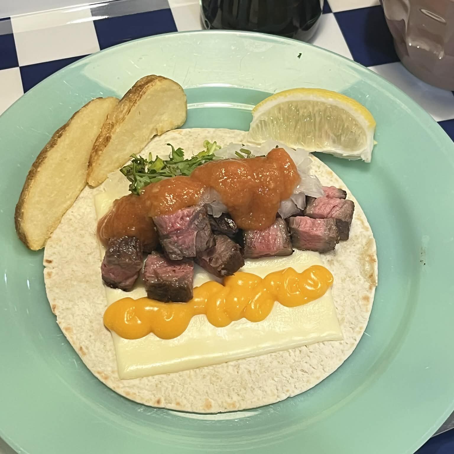 前述した通り、トルティーヤはコーンではなくフラワー(小麦粉)を使っています。いつもの11㎝でなく15㎝と大きめ。2種類のチーズとミディアムレアに焼いたビーステーキをサイコロ状にカットしてのせています。